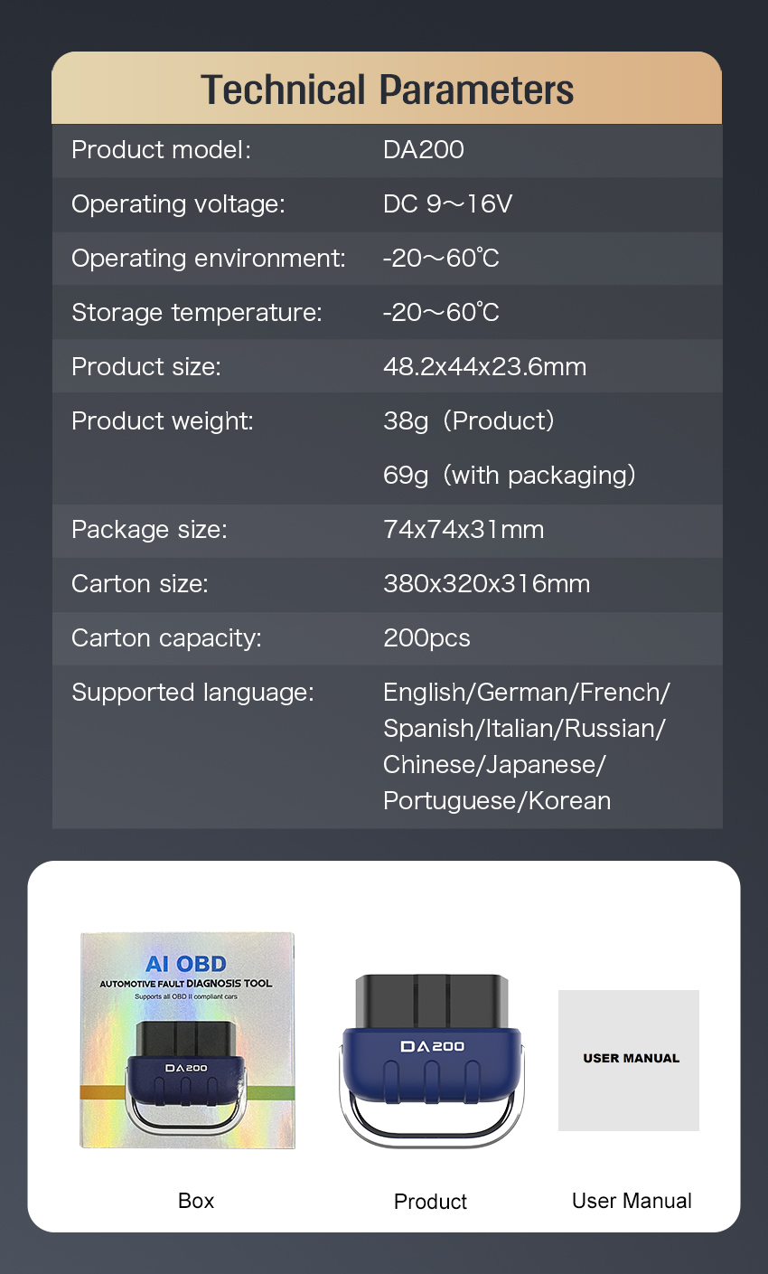 DA200 AI INTELLIGENT DIAGNOSIS & Q&A REVOLUTIONIZE YOUR AUTOMOTIVE FAULT DIAGNOSIS Experience a smarter way to manage your vehicle's health. The DA200 combines advanced AI fault analysis with intelligent Q&A functionality, transforming complex data into clear, actionable advice. Compatible with Mode 6 and 8, this wireless 5.4 device offers real-time data streaming, oxygen sensor testing, and performance analysis, all accessible via our free app. Don’t just read codes; understand them with the power of AI