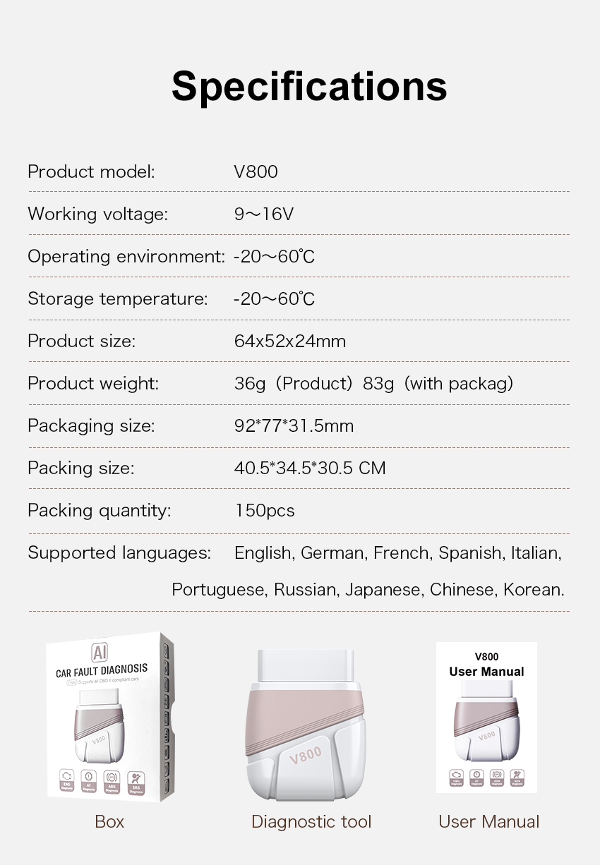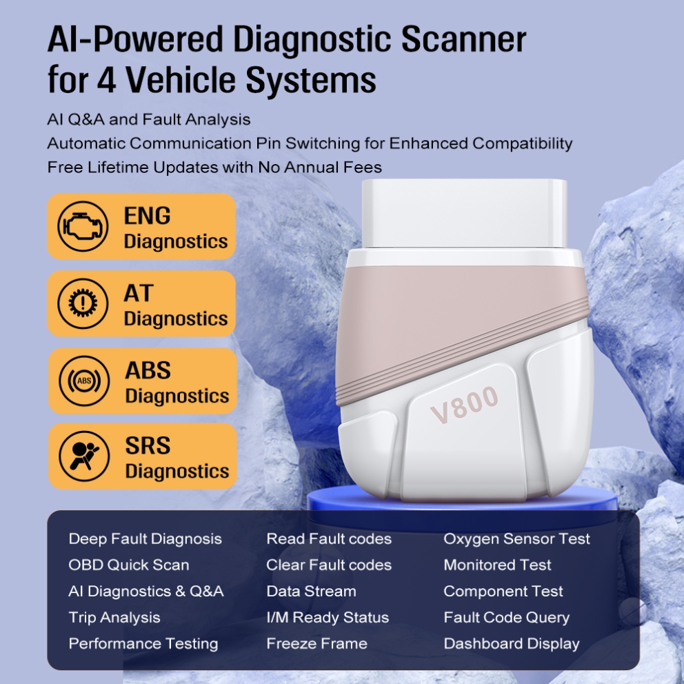 Main Title: V800 AI-Powered Professional Vehicle Diagnostic System Sub-Headline: Deep Logic Analysis for Engine, ABS, SRS, and Transmission. Description: Experience the next generation of automotive care. The V800 combines advanced AI fault analysis with automatic pin switching technology to deliver dealership-level diagnostics at your fingertips. No annual fees, just lifetime precision